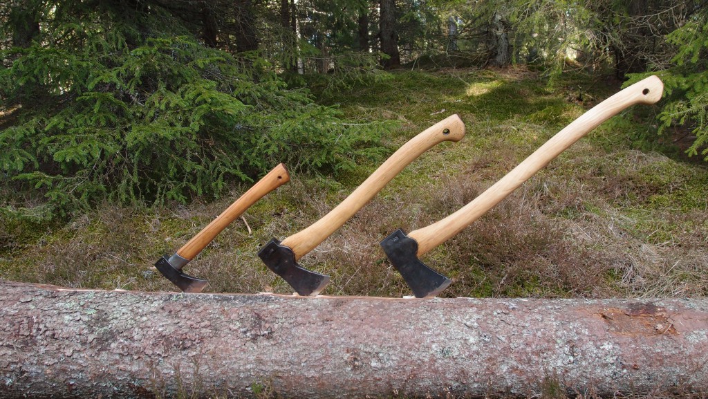 Att välja rätt yxa kan vara svårt, det finns idag många yxor att välja på i olika storlekar och modeller. Valet av yxa beror på vad den ska användas till och även om man behöver bära den så kan vikten vara avgörande. Denna gång skall vi titta på 3 storlekar av yxor, från en liten till en mellan och även en stor yxa. Alla yxorna är från Gränsfors Bruks och tillhör mina privata yxor och den lilla skogsyxan har varit med mig i över 10 år. Något att änka på att en längre yxa är säkrare att använda men är oftast tyngre och kräver mer energi att jobba med.