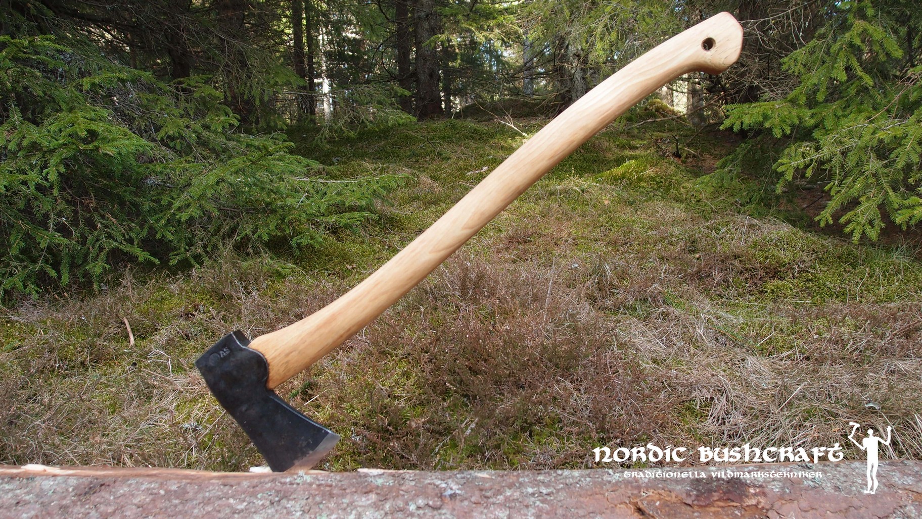 Detta är min äldsta och den yxa jag använt mest och är en kompromiss mellan en liten och en stor yxa. Med en vikt på 1 kg och en längd på 50 cm så är den tillräckligt lång och med tillräckligt tung för att kunna fälla större träd och även klyva rejäla klabbar. Men den är fortfarande tillräckligt liten för att kunna finarbeta med utan att vara för tung. Detta är den yxa jag använt mest och fungerar för del flesta tillfällen och är tillräckligt liten för att packa ner i en ryggsäck och är den perfekta kompromissen mellan en liten och en stor yxa, inte perfekt för något men bra på allt.