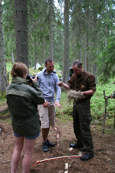 Nu i söndags hade vi besök från en fotograf och en journalist som var nyfikna på vad det här med Bushcraft är och vad det är vi lär ut. Så under några timmar visade vi lite av allt det vi lär ut och visade även upp flera av de saker vi gör på våra kurser. En av höjdpunkterna för dem var när de fick prova på att göra eld med bågdrillen. Dagen avslutades med lunch, lax i jordugn och rotfrukt i fältugn något som uppskattades lika mycket som alla koppar kokkaffe =)